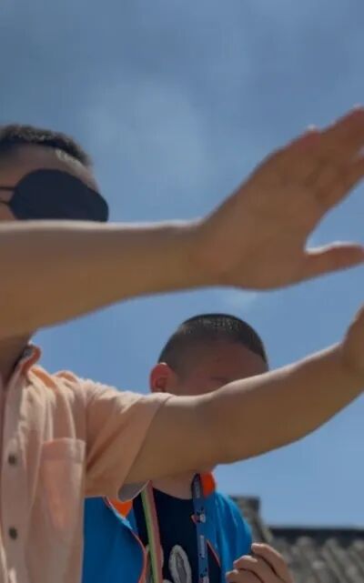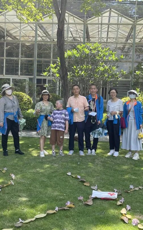 一边说话一边不知不觉就来到了打卡点,小鹏和大家一起完成彩虹拼图,才艺展示,体验残障任务,完成环保任务,其间他或在树荫下,或在草地上坐下来休息了两次,然后就顺利地到达终点,来到了电影院。